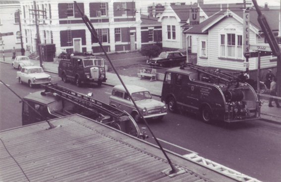 The fire appliances are parked outside the old Onehunga 'Police